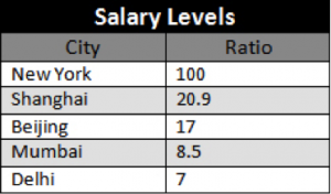 Die Einkommenslücke zwischen Abteilungsleitern in Shanghai und Indien hat sich vergrößert, Shanghai-ansässige Leiter verdienen drei mal so viel wie ihre indischen Kollegen. Beijing-ansässige Abteilungsleiter verdienen fast gleich so viel wie ihre indischen Amtskollegen. Umso höher das Managementlevel, desto kleiner wird die Einkommenslücke zwischen chinesischen und amerikanischen Leitern.