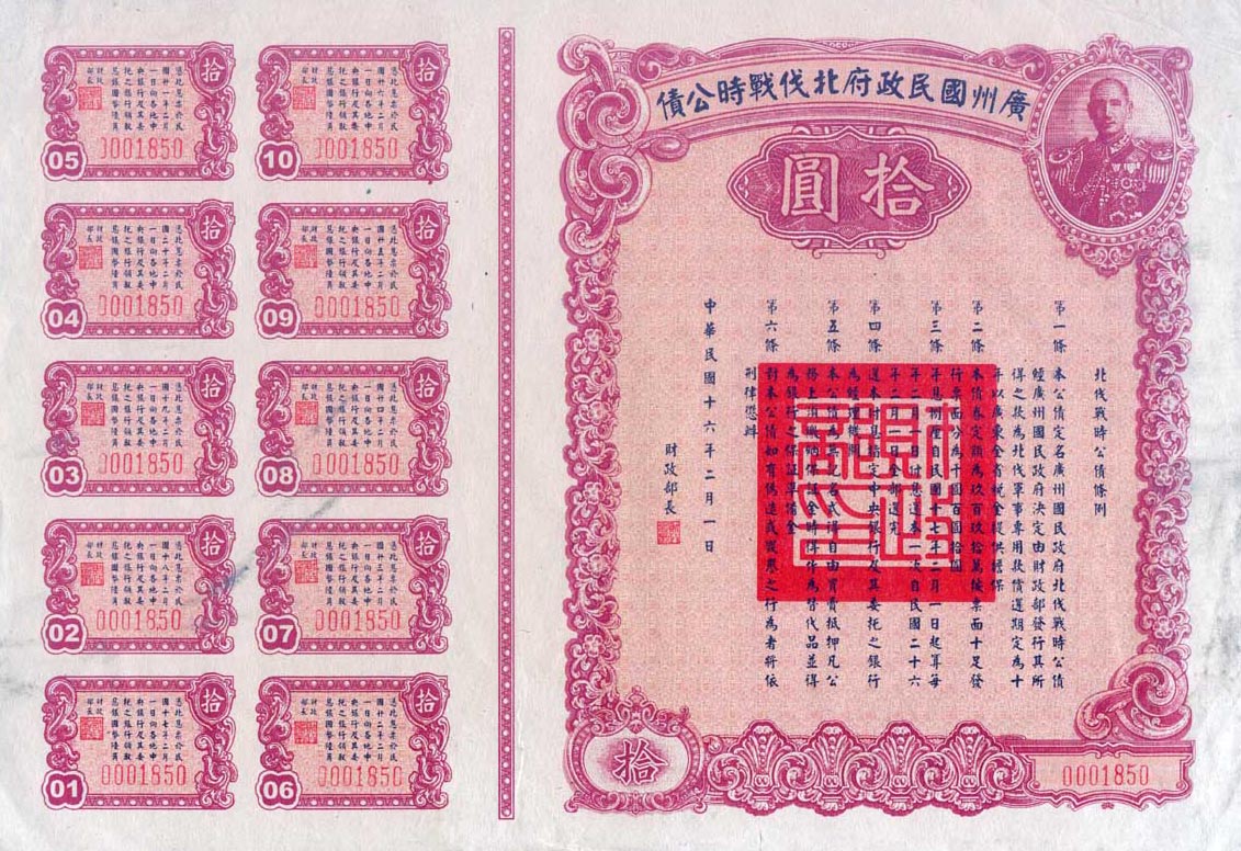 This bond was issued by the Finance Minister of the Kuomintang Party, which was then trying to establish a national government based in Guangzhou prior to the establishment of the Republic of China (click photo to enlarge). Valued at 10 yuan, and issued on February 1, 1927, it was intended to raise money for the war effort against the northern warlords operating in China at that time and support the de facto government’s push to unify the country using the Canton provincial tax base as a mortgage. This bond was fully tradable, and provided a yield of 8 percent per annum for nine years from February 1, 1928, collectable annually from the Central Bank of China, expiring on February 1, 1937. Although he had died two years earlier and been replaced by Chiang Kai-shek, Sun Yat-Sen’s image as the founder of the Kuomintang is in the top right corner. Bonds to the value of 9,900,000 yuan were issued. It is unlikely these were ever redeemed due to the struggles the Kuomintang were soon to be involved with the newly emerging Communist Party (whose own Long March took place the same year as this bond issue) and the onset of World War II which further plunged China into chaos.