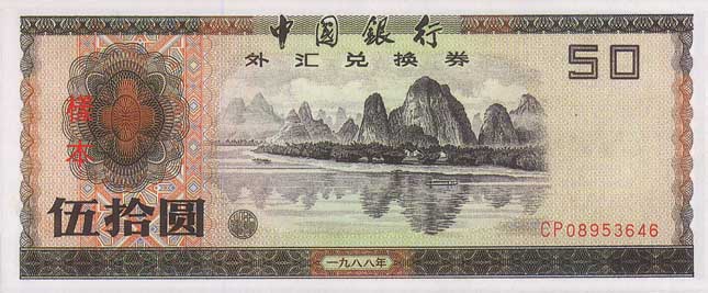 The Bank of China ceased issuing bank notes in 1942, when the Communist Party reorganized China’s banking system and re-positioned the Peoples Bank of China as the main bank note issuing authority, a position which it retains today. The only exceptions for issuance of notes by the Bank of China have been the old Foreign Exchange Certificates, issued only to foreigners until 1990, and two special commemorative issues, for the 50th anniversary of the founding of the People’s Republic of China, and for the new millennium.