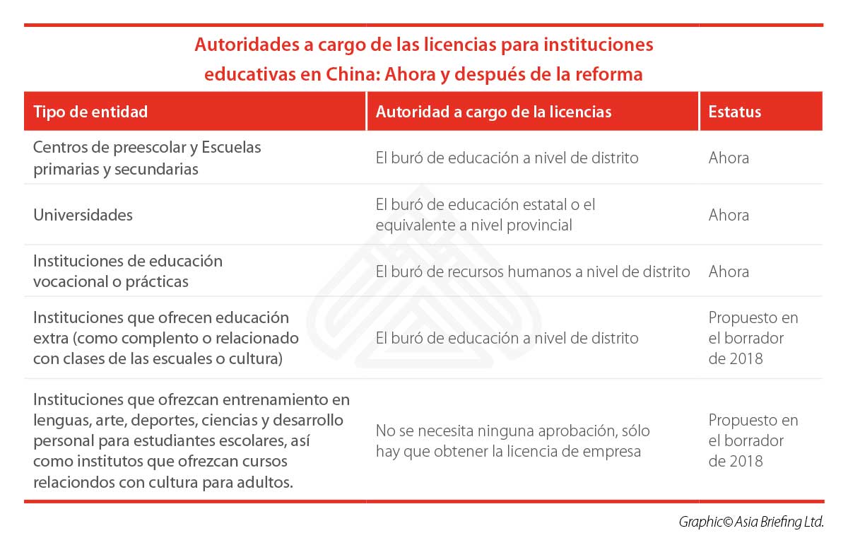 Además, “si la empresa también ofrece formación en línea o enseñanza en línea, se clasificará como un Servicio de Telecomunicaciones de Valor Añadido (“STVA”), bajo el Ministerio de Industria y Tecnología de la Información (MITI) y el Ministerio de Comercio (MOFCOM por sus siglas en inglés) y cuyas aprobaciones se tienen que obtener de antemano”.