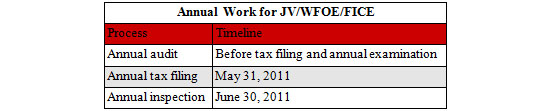 Below is a list of the annual work required for JV/WFOE/FICE as well as their respective timelines: