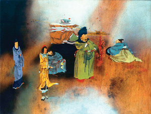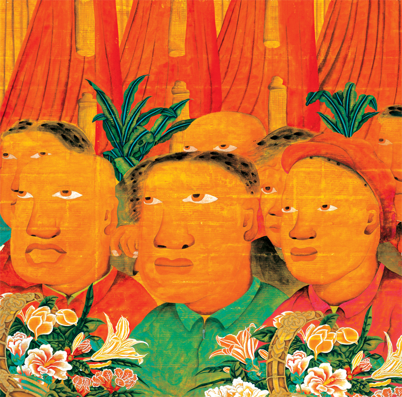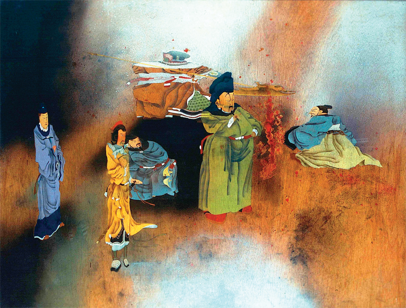 Lu Wei is from Shanghai and graduated at the Shanghai University Academy of Fine Arts. His oil paintings have been exhibited at China’s eighth and tenth national art exhibitions. He takes traditional Chinese themes and characters, and updates them in a more contemporary, almost cartoonish style. Again, the work demonstrates a potential trivialization of Chinese traditional standards in culture and social life.