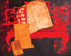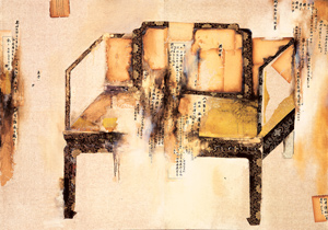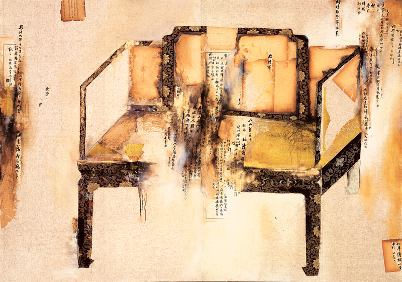 Wang Lifeng is from Inner Mongolia, and a graduate of the Central Academy of Theatre in Beijing. Well known for his use of gold foil, silks and the use of Chinese seals, he focuses very much on the use of traditional materials to create his pieces. In this piece, the artist has focused on a Ming-style antique chair. Both broken and derelict, Wang nevertheless suggests a piece that may yet be restored to value and authenticity. Many contemporary artists demonstrate some unease with the pace of the development within China, Wang’s art is a good example of this.