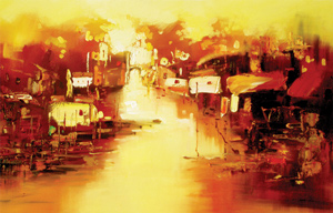 Liu Jiutong is a graduate of the Xi’an Academy of Fine Art, and is now based in Shanghai. He uses a combination of Western oils and Chinese inks, however uses a knife rather than a brush to create the look of many of his works. His pieces draw inspiration from the cities he visits, using the streets and buildings as subject matter for much of his current work. By unifying the thickness and slightness, bold and subtle, exquisite and simple, concrete and abstract, he is constantly exploring and trying new art style. He is a sought after artist especially in Hong Kong, Taiwan and Singapore where his works are on almost permanent display at the top city galleries.