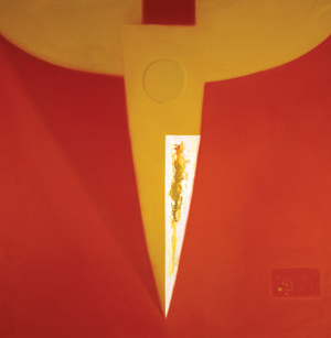 Mao Xuhui is originally from Chongqing, but graduated from the Yunnan Academy of Fine Arts in Kunming. Specializing like many Chinese contemporary artists in oils, his work has also been exhibited internationally and is highly collectible. Mao began to take “power” as a theme in 1989 with the Parents series of paintings. In 1992 he completed the Vocabulary of Power series. It was from the image of the “parent” that the “scissors” was developed. The “parent” is an iconic yet shapeless shadow seated on an overwhelming altar-like throne. It is aloof and awe-inspiring, like a religious icon. The stylized shape of the “parent” resembles a pair of scissors, and it gradually becomes one which, in the Scissors series, presides over domestic settings as the “parent” would sit upon the altar. The menacing presence of the scissors is compounded as an instrument of the everyday; as such it is a domestic as well as “democratic” symbol, carrying associated powers by being visually suggestive of the anthropomorphic god-like “parent” icon.