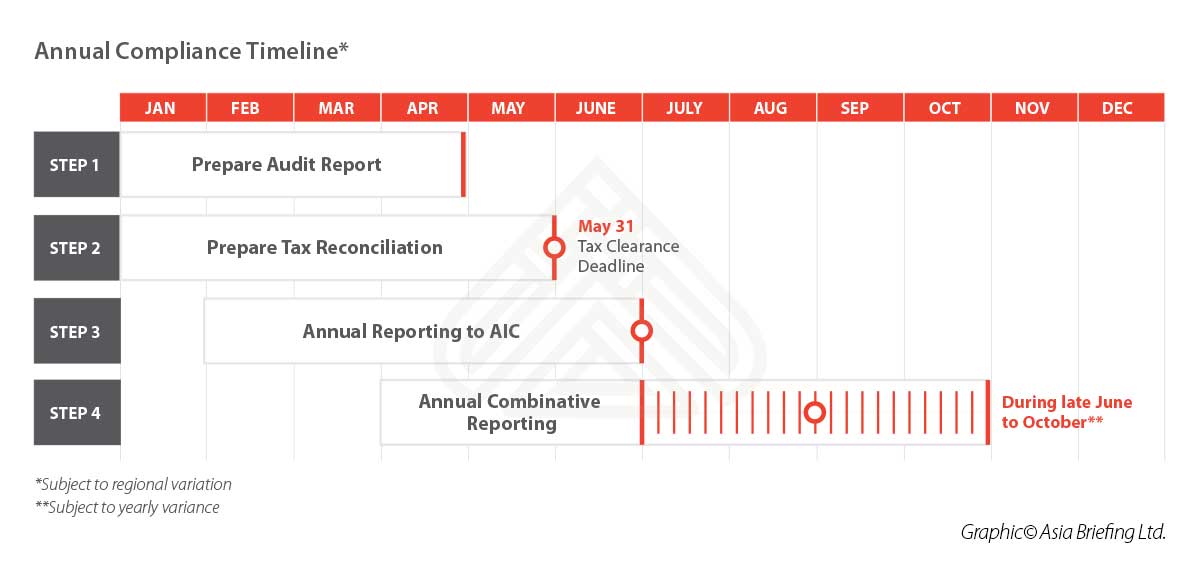 For ROs, annual compliance procedures are simpler. While ROs are exempt from annual combinative reporting, they still need to prepare annual audit report, a tax reconciliation report, and then report to AIC.
