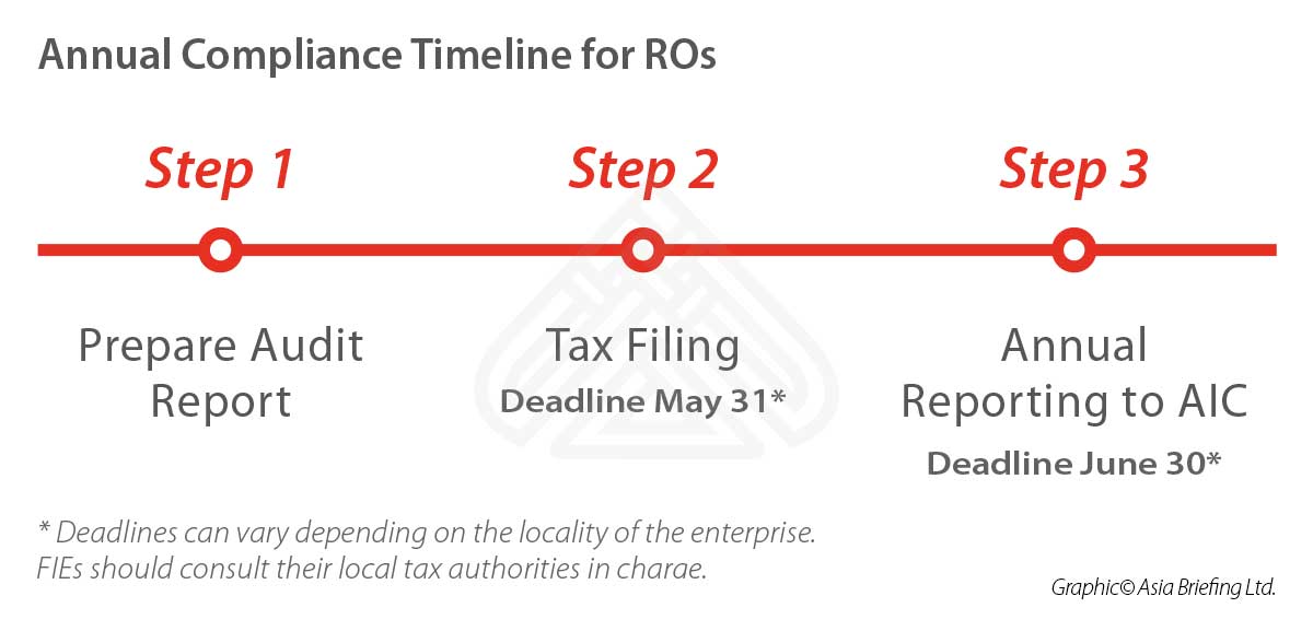 ROs are required to submit an annual report between March 1 and June 30 every year providing information on the legal status and standing information of the foreign enterprise, ongoing business activities of the RO, and an audit report.
