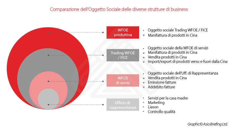 Cio` e` reso possibile dalla possibilita` di individuare un ampio oggetto sociale, che consente infatti di assumere personale locale o straniero, di stringere accordi diretti con i fornitori locali, di eseguire e ricevere pagamenti in valuta locale e di emettere fatture cinesi (le c.d. fapiaos).