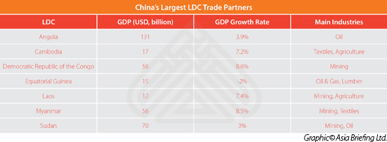 Of the 34 African LDC’s, China trades significantly with Angola, the Democratic Republic of Congo, Equatorial Guinea and Sudan, with Angola, Congo and Sudan all having relatively healthy export trade with China.