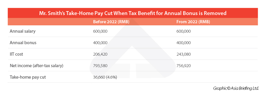 In 2021, the IIT on Mr. Smith’s year-end bonus (that is, his one-off annual bonus) is calculated separately (under Method 1). Assuming that Mr. Smith is not subject to any other tax deductions, if he earns gross salary – including annual basic salary of RMB 600,000 and annual one-time bonus of RMB 400,000 – he will need to pay IIT of RMB 206,420 this year and his net income would be RMB 793,580.