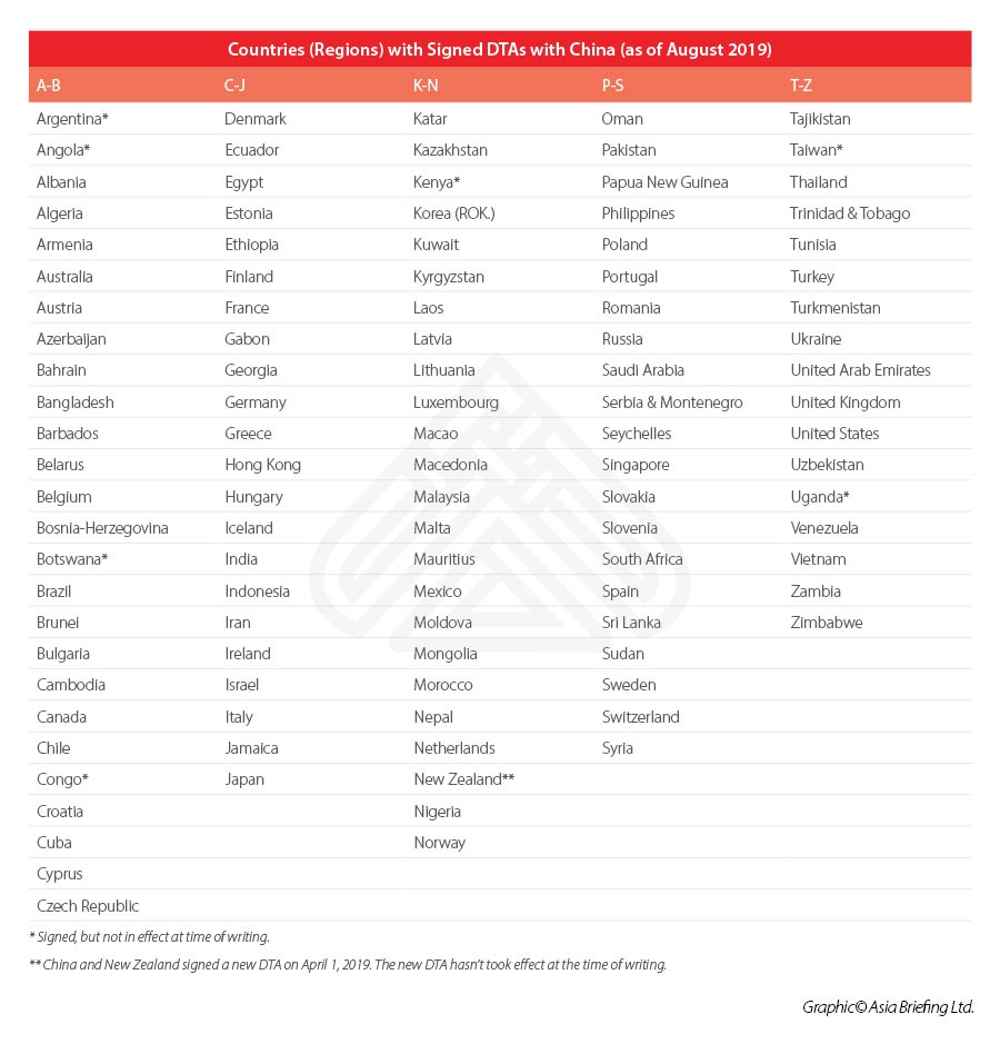 As of September 2018, China has signed DTA with 108 countries or regions, among which 102 treaties have been in effect.