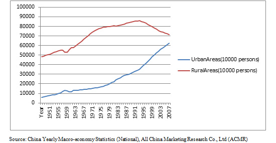 Couch also says that as a majority of China’s population settles in urban areas with rising per capita disposable incomes, the demand for more infrastructure, housing, utilities services such as gas, electricity, and water, and consumption of branded, designer, luxury, automobile, and big ticket appliance goods will continue to escalate. In 2010, 47 percent of the Chinese population lived in urban areas, with the annual rate of urbanization between 2010 and 2015 estimated to be 2.3 percent. The figure below shows the population of rural to urban residents in China from 1949 to 2009, with an obvious direction of crossover within just these couple of years.