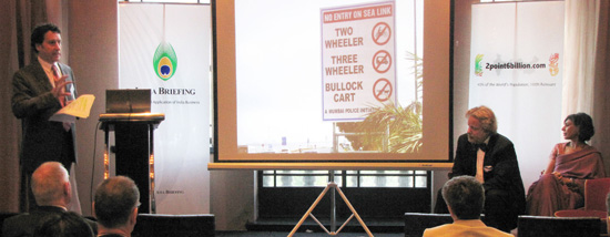 Chris Devonshire-Ellis of Dezan Shira & Associates was first to speak, describing the differences between China and India. Noting that in 1990, India’s GDP had been at a ratio of 89 percent of China’s at the time, he described the paths both countries took over the following two decades, which saw India’s GDP fall to a ratio of just 25 percent of China’s. Citing the improvements made over the past five years, he offered insights into the now rapid development in India and described and introduced a number of projects to illustrate that India’s fortunes are now well on the rebound, and that the country is catching up fast with China. Describing China and India as “not either/or,” he finished by stating that the two countries would provide growth for multinationals of ten percent plus for the next decade and that investments in both should be expanded. To miss out on India now, he stated, “would be the equivalent of ignoring the China market fifteen years ago.”The second speaker was Manjeet Kripalani, of Gateway House India, an Indian foreign policy think tank. Ms. Kripalani is a renowned Indian journalist and commentator, having won the Gerald Loeb award, George Polk award and Daniel Pearl awards in 2004, as well as previously being deputy chief of reporters for Forbes in New York and BusinessWeek’s Indian bureau chief. Her presentation compared China and India’s international development, and linked the two with the on-going development of Africa, recognizing that both countries had managed to introduce Africa into the global supply chain over the past ten years. Pointing out that China’s political structure was one-off and unique as the sole one party state of significance, she emphasized that India’s democracy was the only real exportable system and that such democratic processes helped find negotiable solutions to international and regional problems in a manner that a one party system lacked.Mark Hannant of Veri Mumbai explains India business to a packed audience
