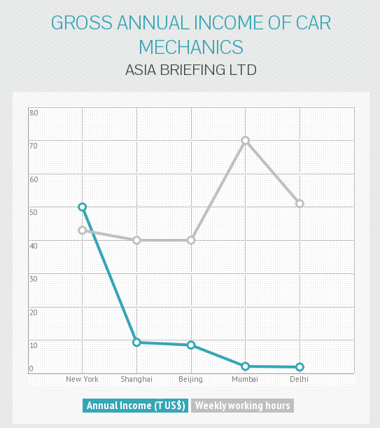 Automechaniker haben eine abgeschlossene Ausbildung, haben fünf Jahre Berufserfahrung und sind ungefähr 25 Jahre alt. Löhne in New York sind sechs mal höher als in Beijing und ungefähr fünf mal höher als in Shanghai. New Yorker Automechaniker verdienen durchschnittlich ungefähr 25 Mal mehr als Ihre Amtskollegen in Indien, trotz alledem haben sie eine Arbeitswoche mit 20 Stunden mehr. Shanghais Mechaniker gehen schätzungsweise für die gleiche Arbeitszeit arbeiten, jedoch nur für 20 Prozent des New Yorker Gehalts.