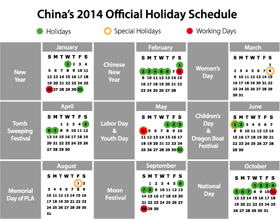 Jan. 7 – Chinas Generaldirektion des Staatrats veröffentlichte am 11 Dezember 2013 das „Rundschreiben zur Anordnung Bestimmter Feiertage im Jahr 2014“ (Guobanfamingdian [2013] No.28) und verkündete hiermit die offizielle Nationale Feiertagsregelung für 2014, welche wie folgt lautet: