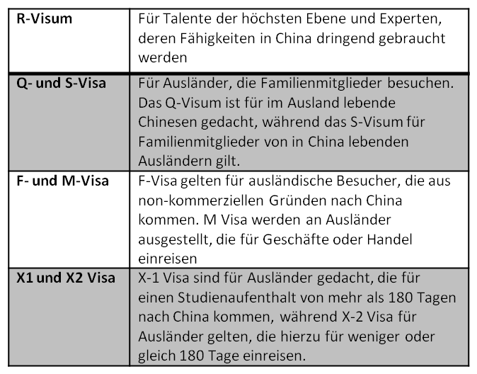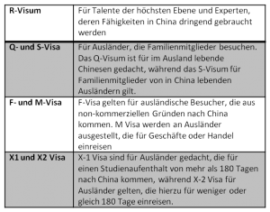 Das Q-Visum wurde als Antwort auf die Nachfrage von in Übersee-Chinesen kreiert, die sich bessere Ein- und Ausreiseprozeduren wünschen und wird an im Ausland lebende Chinesen, die Verwandte im Land besuchen, ausgestellt. Das S-Visum wird an Verwandte ausländischer Bürger in China ausgestellt, die zu Familienzusammenkünften einreisen.