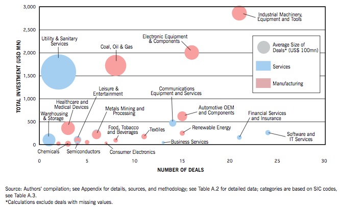 Bei Fusions- und Akquisitionsgeschäften sind chinesische Unternehmen nicht auf bestimmte Industrien konzentriert, sondern sie investieren eher in ein breites gewerbliches Spektrum. In 11 Industrien in den Vereinigten Staaten, wurden jeweils Deals der Chinesen abgeschlossen, die ein Investitionsvolumen von mindestens US-Dollar 200 Millionen besaßen. Ein Drittel davon wurde im Servicesektor investiert und zwei Drittel im Industriesektor, beispielsweise bei Industriemaschinen und Anlagen für Elektronik, Ölförderung, Gasförderung, regenerative Energien, Metalle, Medizintechnik und Kohle. Chinas größter Vorteil in den Vereinigten Staaten besteht in den Industrien, in denen China Wettbewerbsvorteile im eigenen Land gegenüber ausländischen Konkurrenten hat, wie zum Beispiel bei Haushaltsgeräten, dort gibt es Marken wie beispielsweise Haier, der Baumaschinenhersteller Sany, sowie in der Unterhaltungselektronik, zum Beispiel Lenovo, die durch diese internationale Aktivitäten ihren Wert in der Wertschöpfungskette erhöhen konnten.