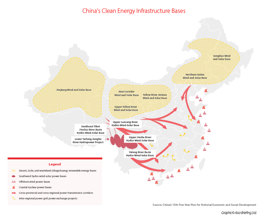 China’s renewable infrastructure build-out is focused heavily on the expansion of solar, wind, and hydropower. In the renewable infrastructure planning, integrated wind and solar projects are concentrated across the “Three North” regions – northwest, northern, and northeast China – while integrated wind, hydro, and solar power are clustered in southwest China, where there are significant hydropower resources, in particular in eastern Tibet, western Sichuan, and northwestern Yunnan. Coastal nuclear power and offshore wind power are planned along China’s eastern coastline.