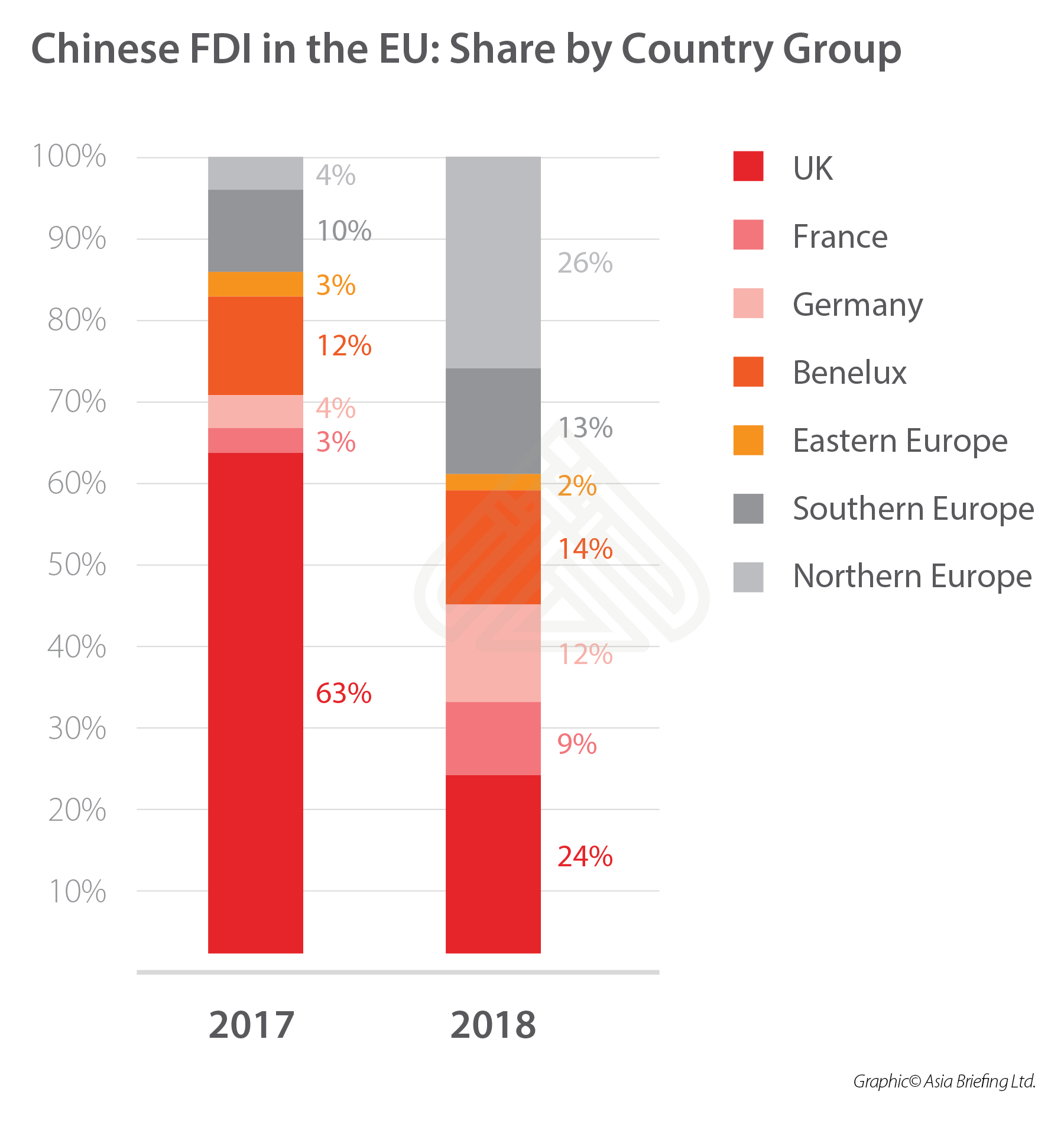 Turning to 2017 and 2018, the UK received 63 percent and 24 percent of Chinese FDI, respectively – more than any other EU country in both years.
