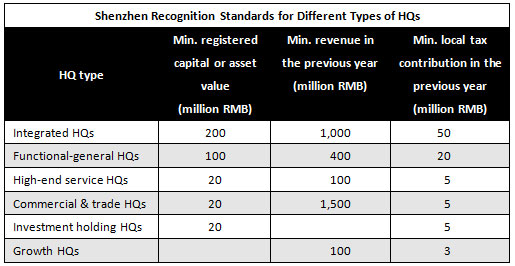 In addition to the basic requirements listed above, Shenzhen also specified RHQ recognition standards for FIEs of different sizes: