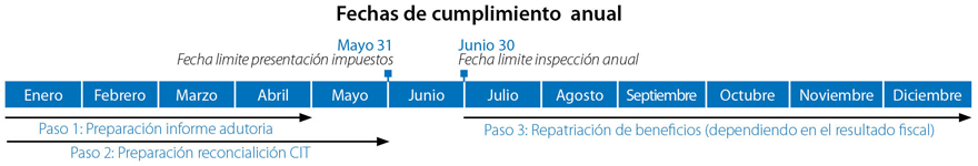Cuando se envían los fondos, los bancos normalmente requerirán un informe auditoría y el recibo de pago de impuesto de sociedades para conocer el beneficio anual distribuible. Si la empresa elige posponer la repatriación al siguiente año por motivos de tesorería, será exigido un informe de auditoría adicional.