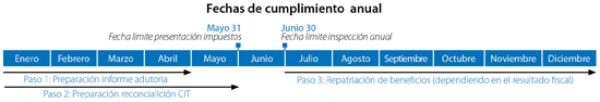 Como se ha mencionado en el primer artículo, solo los beneficios que han sido declarados en la auditoria anual pueden ser repatriados. La auditoría anual conducida por la autoridad local pertinente suele normalmente estar finalizada sobre finales de Junio o principios de Julio cada año (ver tabla) La auditoría permite a la Administración Fiscal Estatal (SAT) asegurar que se han pagado todos los impuestos de sociedades (CIT) y calculado los beneficios que se pueden distribuir. Adicionalmente, no se podrán distribuir benéficos antes de que hayan sido compensadas las pérdidas de años anteriores, después de lo cual el balance podrá ser distribuido. La autoridad fiscal confirmará la cantidad que una empresa puede repatriar basada en el porcentaje de beneficio neto.