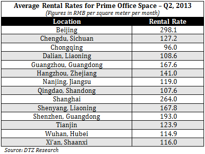Average rental prices for prime office spaces during the second quarter of 2013 can be found below: