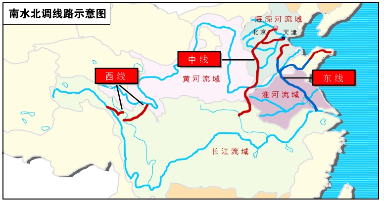 Die chinesische Regierung arbeitet seit dem Jahr 2002 an dem Süd-Nord Wassertransferprojekt (SNWTP). Dieses gigantische Projekt hat eine ausgeglichenere Wasserverteilung im Land zum Ziel, und wird voraussichtlich 2050 fertiggestellt sein. Die Kosten betragen etwa Euro 42,3 Milliarden, und allein für die mittlere Route müssen etwa 300.000 Menschen umgesiedelt werden.