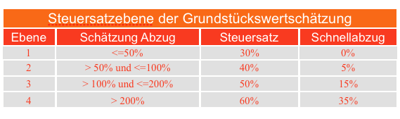 Anfallende Steuer = (Höhe der Wertschätzung x Steuersatz) – (Summer der abzugsfähigen Aufwendungen x Schnellabzug)