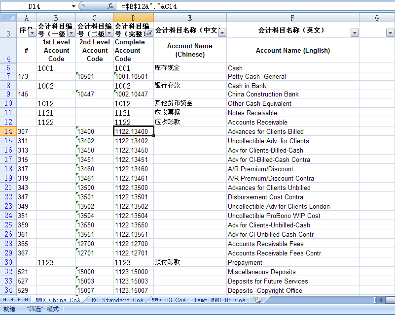Der Screenshot zeigt in den linken Spalten die 1st und 2nd level account codes und rechts davon, wie dadurch der chinesische Kontenrahmen dem globalen Kontenrahmen zugeordnet wird und die beiden Kontenrahmen konsolidiert werden. Beide Ausführungen der Finanzberichterstattung sind damit möglich.