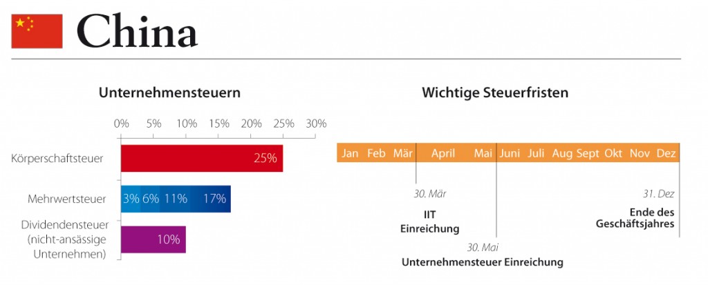 Unternehmen und andere Organisationen, die Einkommen generieren, bezahlen eine auf das Einkommen aus Produktion, Geschäftsbetrieb und anderen Quellen basierende Körperschaftsteuer (Corporate Income Tax – CIT). Der normale Körperschaftsteuersatz beträgt 25 Prozent für ausländische und einheimische Unternehmen in China. Die Körperschaftsteuer wurde auf eine Jahresbasis festgelegt, wird aber häufig auch vierteljährlich bezahlt, mit Berichtigungen die entweder rückerstattet oder in das nächste Jahr vorgetragen werden und einer auf die Jahresendprüfung basierenden Endkalkulation.