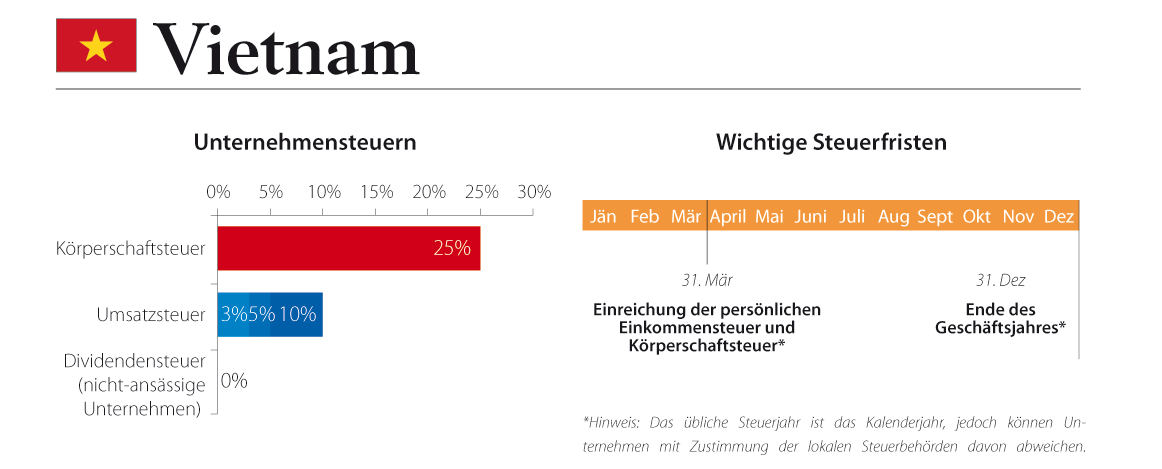 Vietnams Körperschaftsteuersatz beträgt 25 Prozent, sowohl für einheimische als auch für ausländische Unternehmen. Für Unternehmen deren Geschäftsfeld in der Erschließung, Erkundung oder in der Extrahierung von Öl, Gas oder anderen seltenen und wertvollen natürlichen Ressourcen liegt, rangiert der Satz zwischen 32 und 50 Prozent, abhängig vom einzelnen Projekt und Unternehmen.
