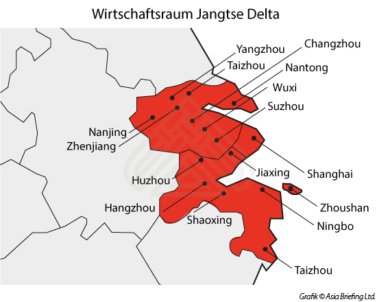 Der Wirtschaftsraum Jangtse Delta umfasst mit den folgenden 16 Städten die größte Metropolregion der Welt: Shanghai, Nanjing, Suzhou, Wuxi, Changzhou, Yangzhou, Zhenjiang, Nantong, Taizhou, Hangzhou, Ningbo, Huzhou, Jiaxing, Shaoxing, Zhoushan und Taizhou. 2010 hat der Staatsrat den „Regionalplan Jangtse Delta” veröffentlicht, welcher die auch als YRD (Yangtze River Delta) bezeichnete Region als zentrales Tor in die Asien-Pazifik Region und als globales Zentrum für moderne Dienstleistungen und Produktion bewirbt. Der Plan zielt dabei auf ein regionales Bruttoinlandsprodukt von RMB 110.000 pro Kopf bis 2020 ab.