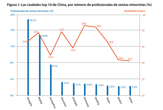 La presencia de profesionales de venta al por menor es más común en las ciudades de primer y segundo nivel: aproximadamente un 40 por ciento en las primeras, y casi un 20 por ciento en las segundas. Sólo en el subsector minorista especializado los profesionales se encuentran más dispersos: Shanghai, Beijing y Guangzhou representan en conjunto el 36,4 por ciento de los profesionales, frente a un poco más del 40 por ciento para los otros subsectores.