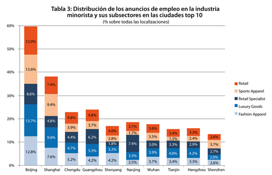 La tabla 3 nos da una idea de las ciudades en las cuales los diferentes subsectores están centrando sus esfuerzos de contratación. Las oportunidades de trabajos de ventas de ropa de deportes y de artículos de lujo están concentradas sobre todo en Beijing y Shanghai. Sin embargo, los datos muestran que los empresarios de artículos de lujo están buscando cubrir posiciones en Tianjin and Hangzhou con mayor intensidad en comparación con el promedio general. Las oportunidades de empleo del subsector de minoristas especializados tienden a concentrarse en Beijing (8,6 por ciento), si bien en niveles inferiores a los de la industria minorista global (12 por ciento). Los trabajos se ofrecen en mayor proporción a la industria en Guangzhou y especialmente en Nanjing. En cuanto al subsector de ropa de moda, las vacantes están en su mayoría en Beijing y Shanghai (12,8 por ciento y 7,6 por ciento, respectivamente), con Shenyang y Chengdu ocupando un porcentaje sustancial.