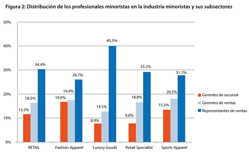 Los profesionales de este subsector son los más mayores (28,7 años) y los más estables (28,8 meses en promedio por empleador), habiendo trabajado para un comparativamente menor número de empleadores (2,19). Al nivel de representantes de venta (33,2 por ciento de los profesionales del subsector minorista especializado), son menos experimentados que el promedio. Sin embargo, para alcanzar una posición de gerente de sucursal (9 por ciento de los profesionales del subsector minorista especializado) se necesitan alrededor de 7,7 años de experiencia laboral, la cantidad más alta para los directores de sucursal de la industria minorista. Esto es comprensible considerando el tamaño de los establecimientos operados usualmente en este subsector, y el número de compañeros de trabajo bajo su supervisión. Los gerentes de ventas (18,8 por ciento) son también bastante experimentados (6,9 años, al igual que en el subsector de los artículos de lujo), pero por detrás de los del subsector de la ropa de deportes (7,8 años). Si el subsector de los artículos de lujo está orientado hacia las mujeres, la fuerza de trabajo de los minoristas especializados permanece orientado hacia los hombres, especialmente cuando se trata de puestos de gerencia: 62,4 por ciento de los gerentes de sucursales, y 68 por ciento de los gerentes de ventas.