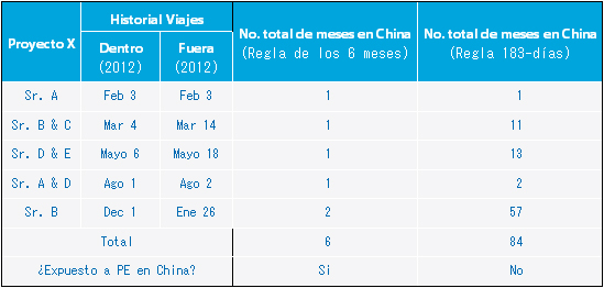 El cálculo del inicio del periodo se inicia el mes en el que los expatriados llegan por primera vez con el objetivo de la realización del servicio, hasta el mes en el que los expatriados se van tras la finalización del servicio. Se ignora el número exacto de días. Más bien, la prestación de servicios en China para un solo día al mes está considerada como prestación de servicios para un mes entero. Sin embargo, si el expatriado está en China para llevar a cabo los servicios pertinentes durante 30 días consecutivos, se deducirá un mes. Un PE está constituido si el expatriado está en China durante más de seis meses, de acuerdo con este método de cálculo en cualquier periodo de 12 meses. Método de cálculo según lo estipulado en la Circular Guoshuihan [2007] No. 403 que fue invalidada en enero de 2011. Sin embargo, a partir de ahora, no se han fijado nuevas normas para reemplazarlo, y las autoridades tributarias siguen adoptando este método de cálculo del periodo de seis meses.