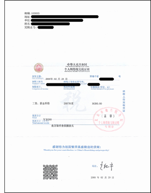 Mar. 24 – Pictured at right is a tax paid form for individual income tax filings for 2007. These are sent to the place of work or residential address of expatriate individuals who have been working in China and who are subject to declaration of IIT on their salaries for 2007.