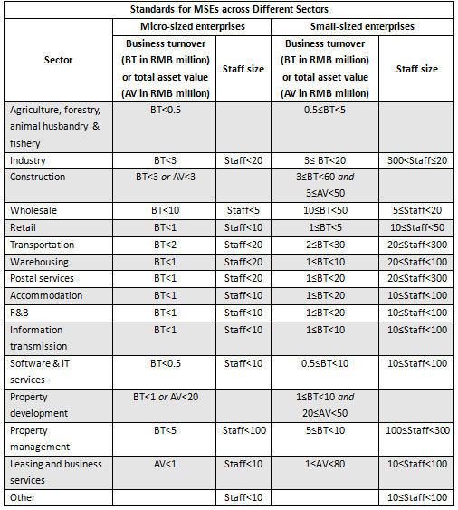 The Circular also clarified that the identification of aforesaid MSEs shall follow the standards listed in the “Circular on Standards for Small and Medium Sized Enterprises (SMEs) Classification (gongxinbulianqiye [2011] No.300),” which was co-issued by the Ministry of Industry and Information Technology, the National Bureau of Statistics, the National Development and Reform Commission, and the Ministry of Finance in June this year.
