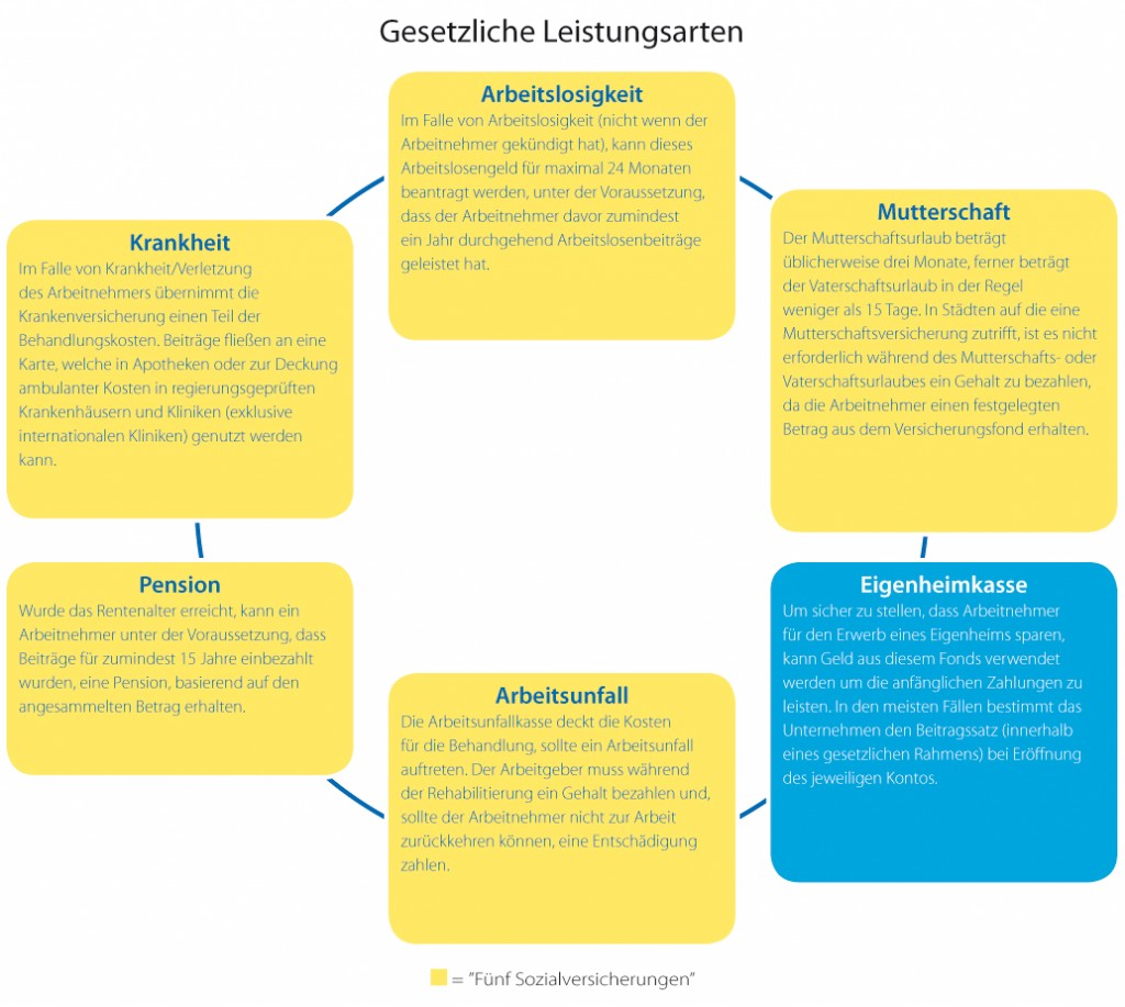 Ein Arbeitnehmer in China einzustellen, kostet aufgrund eines Faktors, generell 35-40 Prozent mehr als der auszahlbare Bruttobetrag – gesetzliche Leistungen. Gesetzliche Leistungen sind Beiträge von Arbeitgeber und Arbeitnehmer zu den “fünf Sozialversicherungen” (Mutterschaftsversicherung, Krankenversicherung, Arbeitslosenversicherung, Rentenversicherung und Arbeitsunfallversicherung) und Eigenheimkasse. Basierend auf den Vorschriften der Zentralregierung, variieren die Umsetzungen der gesetzlichen Leistungspolice geographisch (wie auf S. 6 erläutert) und nach dem Wohnsitz des Arbeitnehmers (d.h. dauerhafter Einwohner der Stadt des Arbeitgebers oder andere).