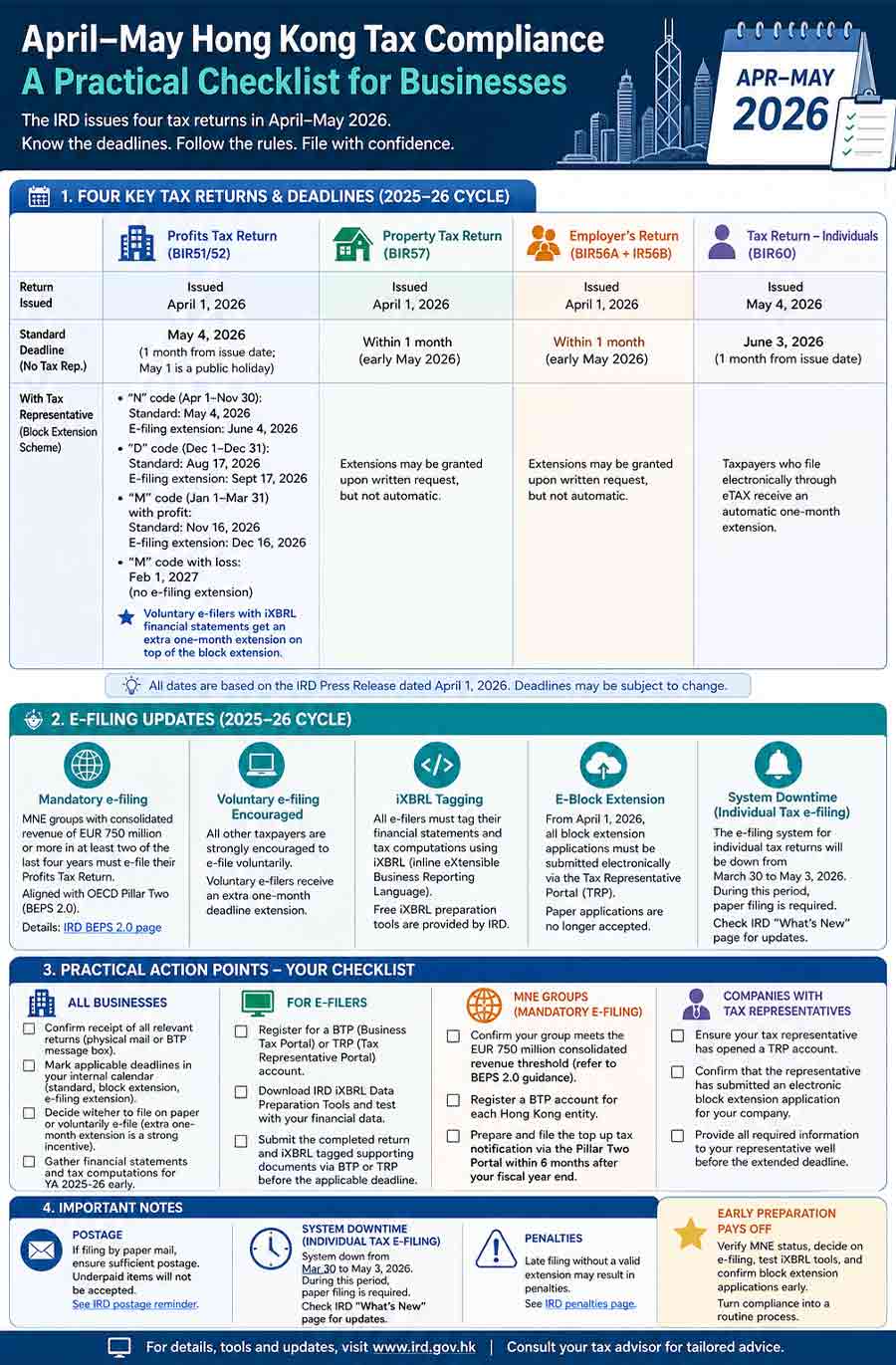 Staying ahead of the April-May Hong Kong tax compliance cycle requires more than just noting dates. Businesses should verify their MNE status, decide on e-filing, test iXBRL tools, and confirm that tax representatives have submitted electronic block extension applications. Early preparation turns compliance from a scramble into a routine process. Companies are advised to consult their tax advisors and monitor the IRD website for any further updates.