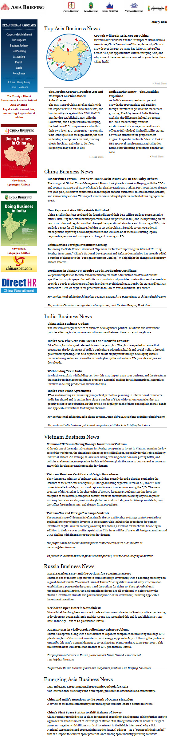 Complimentary weekly email with the best of China, India, Russia, Vietnam and Emerging Asia business news, regulatory, and policy updates