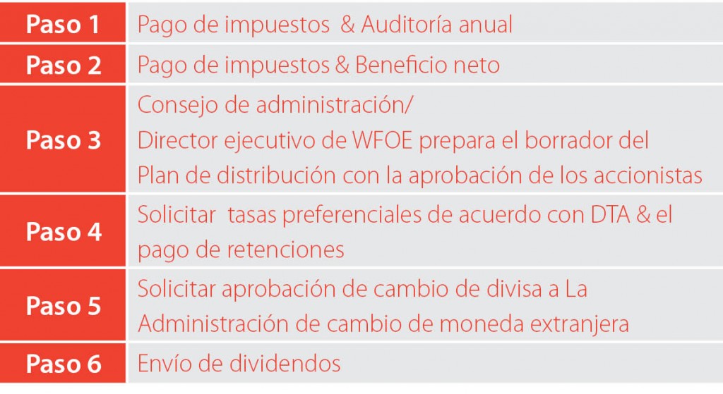 China carga el 10 por ciento a las tasas de dividendos sobre la repatriación de beneficios, además de un 25 por ciento de impuesto de sociedades. De todos modos, muchas de los tratados fiscales bilaterales de China (como aquellas con Hong Kong) provisionan una cláusula que reduce el ratio de la tasa de dividendos un 50 por ciento. Esta reducción potencial, que ofrece ahorros considerables para las empresas, no es algo que las administraciones de impuestos mostrarán a los contribuyentes. Para asegurar este ahorro, es esencial que los inversores planeen con antelación, ya que solicitar los beneficios del tratado fiscal es solamente un paso dentro de un largo proceso de declaración y repatriación de dividendos.