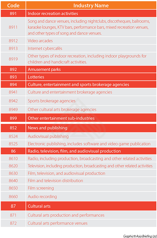 One problem in discussing the entertainment industry in China is the misalignment between what is typically referred to as “show business” in the West versus the administrative definition of the “entertainment industry” (娱乐业) in China. The former typically encompasses a wide range of creative performances and media products including animation, dance, film, music, radio, television, theater; whereas in China, these sub-sectors are split between at least two major industry classifications administered by the National Bureau of Statistics (NBS). According to the NBS’s Industrial Classification for National Economic Activities (GB/T 4754-2011), the “entertainment industry” is divided as appearing in the top-left.