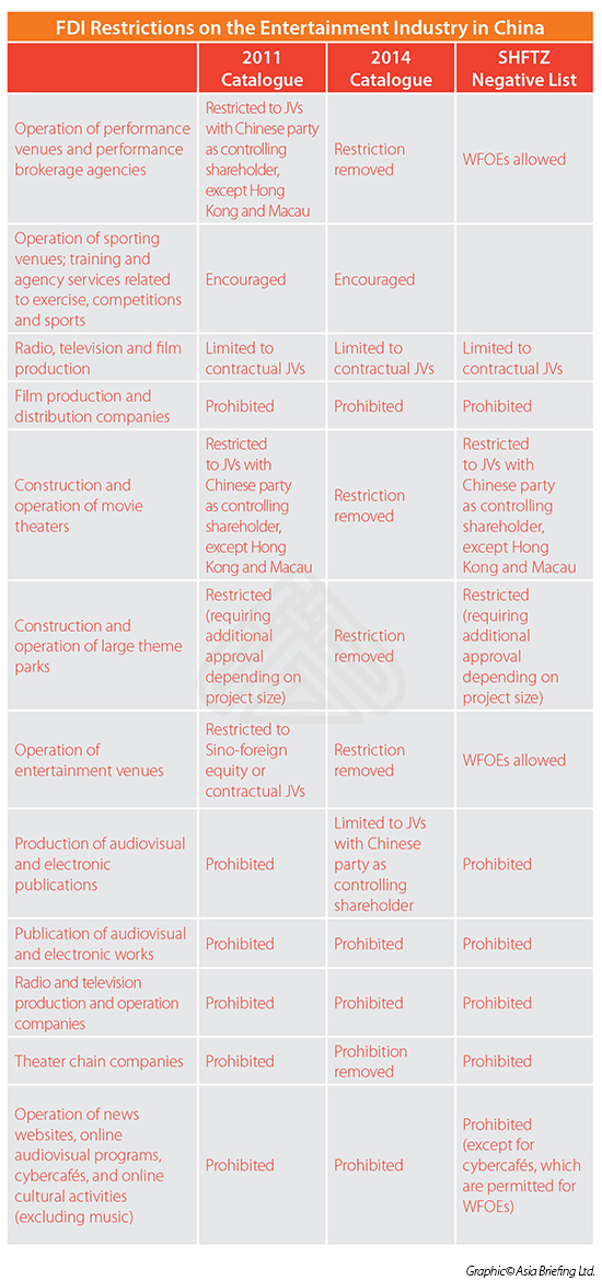 Historically, the entertainment industry in China has been subject to some of China’s tightest restrictions on foreign investment. Recently, however, these have given way to targeted liberalization measures. In the chart below, we compare the treatment of various sub-sectors of the entertainment industry according to three governing documents: