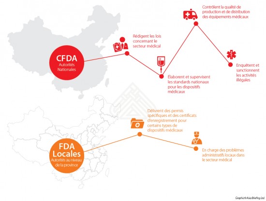 En Chine, les autorités administratives et de supervision pour le secteur des dispositifs médicaux sont séparées selon deux niveaux. Au niveau national, l’Administration de la Nourriture et des Médicaments (CFDA en anglais) est en charge de la régulation et du contrôle du secteur des équipements médicaux pour l’ensemble du territoire.