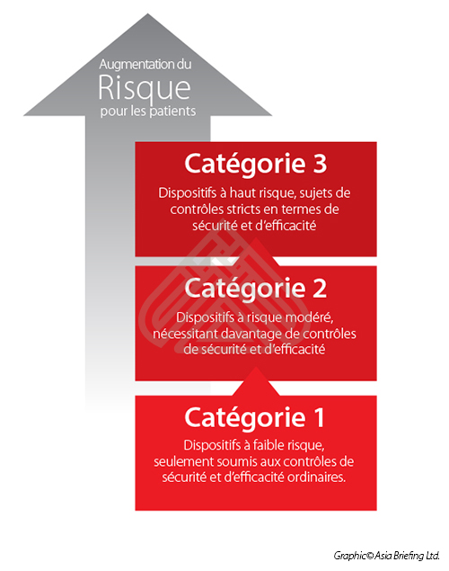 En Chine, la classification est définie selon l’ordonnance 15 de l’Administration de la Nourriture et des Médicaments ainsi que d’autres textes réglementaires. Bien que plusieurs facteurs complexes entrent en ligne de compte pour définir la classification d’un produit, on peut dire de façon générale que les équipements sont répartis en trois catégories en fonction du risque qu’ils présentent pour les patients ou les utilisateurs.