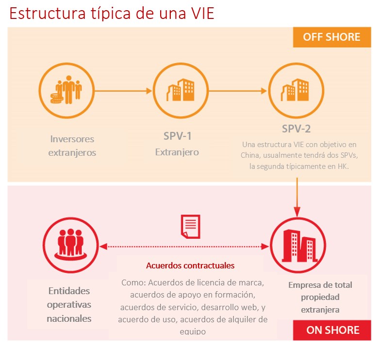 En vista de las restricciones previamente mencionadas y de las barreras de entrada al Mercado, los inversores extranjeros usan a veces el modelo “Entidades de interés variable (VIE)” para acceder a la industria de la educación en China. Bajo este modelo, los inversores extranjeros retienen el control sobre entidades que operan domésticamente en China a través de una serie de acuerdos contractuales en lugar de accionariado directo. Los ejemplos típicos incluyendo el TAL Education Group, New Oriental, y Maple Lead Educational System, la estructura de los cuales está resumida en el gráfico de la parte superior a la izquierda.