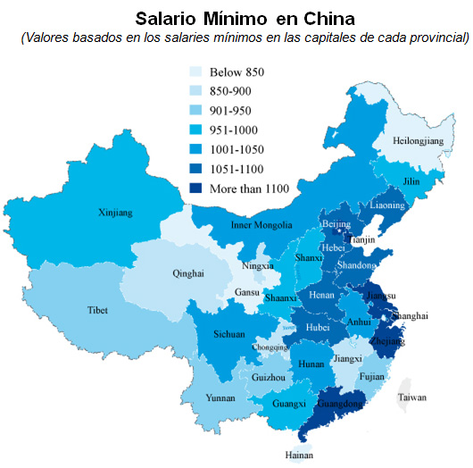 Cómo se manifiesta este aumento es un interesante caso que es quizás más fácilmente ilustrado por el mapa y la tabla abajo. Es fácil ver de un vistazo que las provincias costeras bien conocidas cuentan con relativamente más altos niveles del salario mínimo que las zonas occidentales que se desarrollan a un ritmo más lento. Sin embargo, existen anomalías locales. Haikou, la capital de la provincia de Hainan, mantiene un salario mínimo más bajo que el de Kashgar, por ejemplo. El mapa de abajo es basado en los niveles presentes del salario mínimo en el centro de las capitales de cada región. Eso significa que para la provincia de Fujian, usamos Fuzhou en vez de Xiamen como el indicador clave, y para la provincia de Guangdong, usamos Guangzhou en vez de Shenzhen. Para cifras especificas, la tabla de abajo muestra los niveles del salario mínimo de las 50 ciudades más grandes de China.