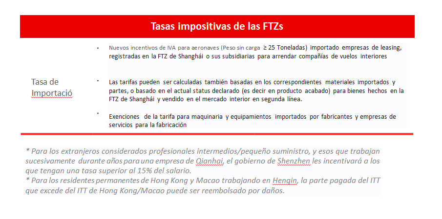 Es decir, hay algunos incentivos fiscales para algunos determinados colectivos y empresas en las distintas FTZs. Por ejemplo, Qianhai y Hengqin de la FTZ de Guangdong, y Pingtan de la FTZ de Fujian, proporcionan un incentivo fiscal a unas determinadas empresas en base a sus respectivas profesiones.